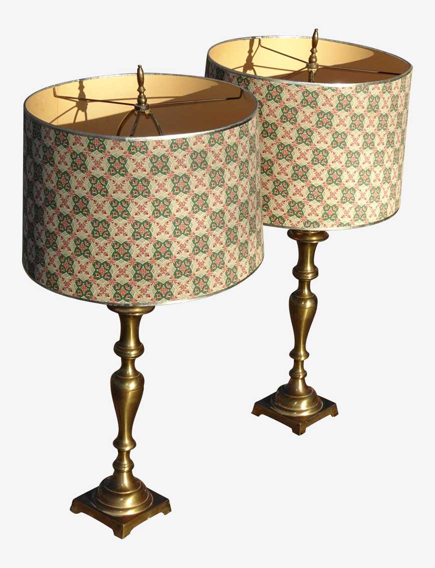 Mid Century Modern Gold Table Lamps W Green & Orange Lamp Shades - a Pair