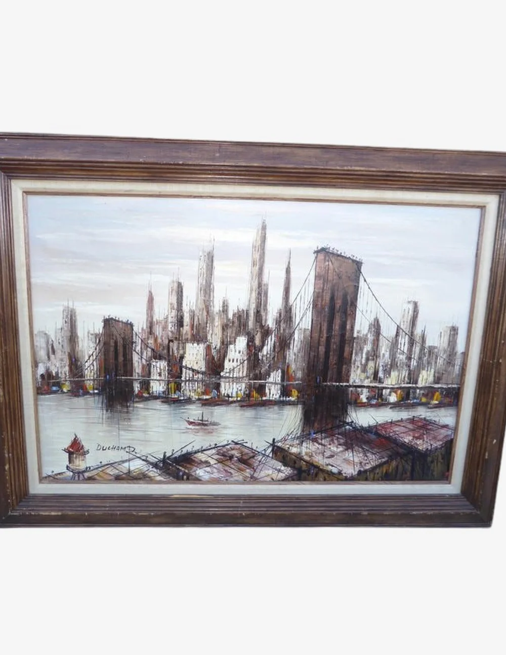 Vintage Mid Century Brooklyn Bridge Picture by H. Duchamp Oil on Canvas Painting
