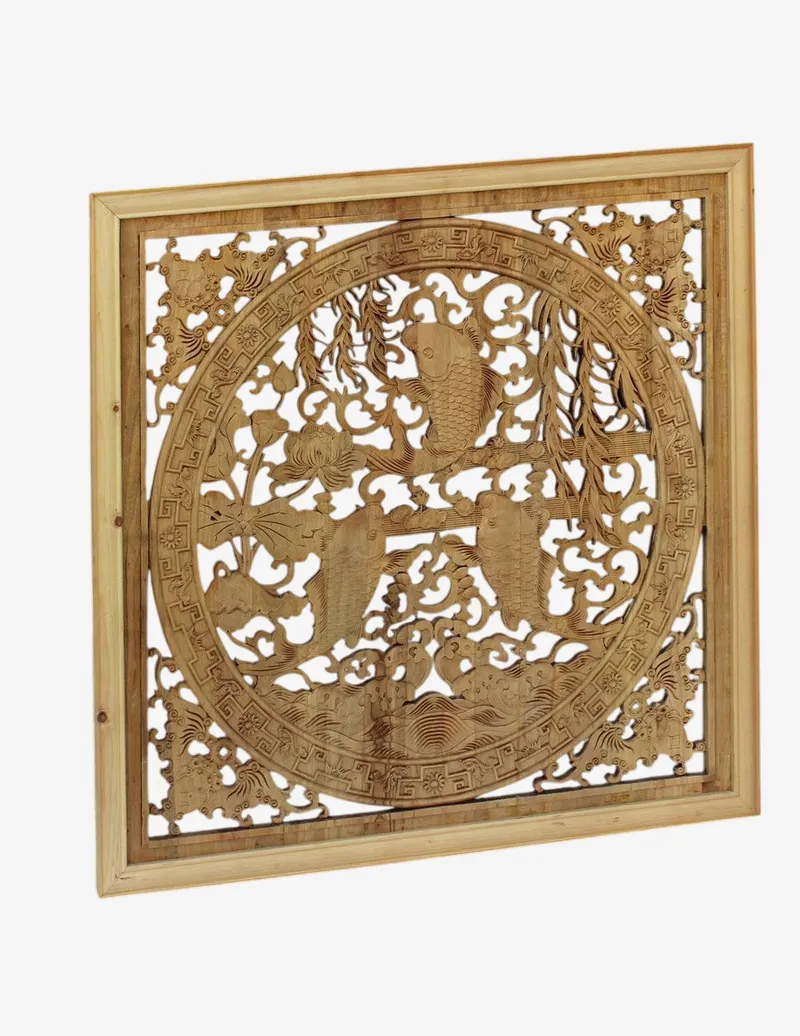 Chinese Square Flower Fishes Wooden Wall Plaque Panel