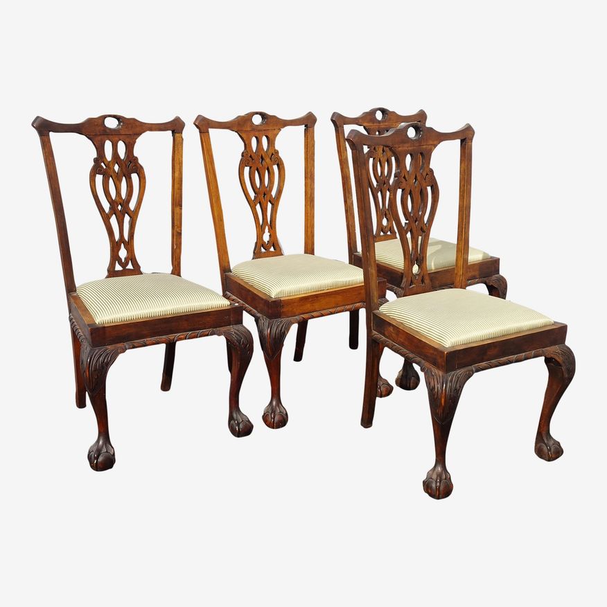 French Louis XVI Chippendale Side Chairs Ball & Claw Feet with Silk Fabric - Set of 4