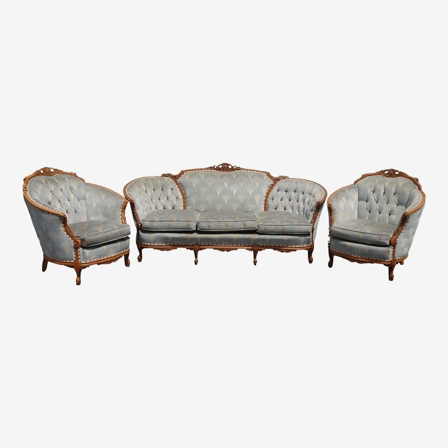 KashewVintage French Provincial Ornate Louis XVI Rococo Blue Velvet Settee & Two Chairs